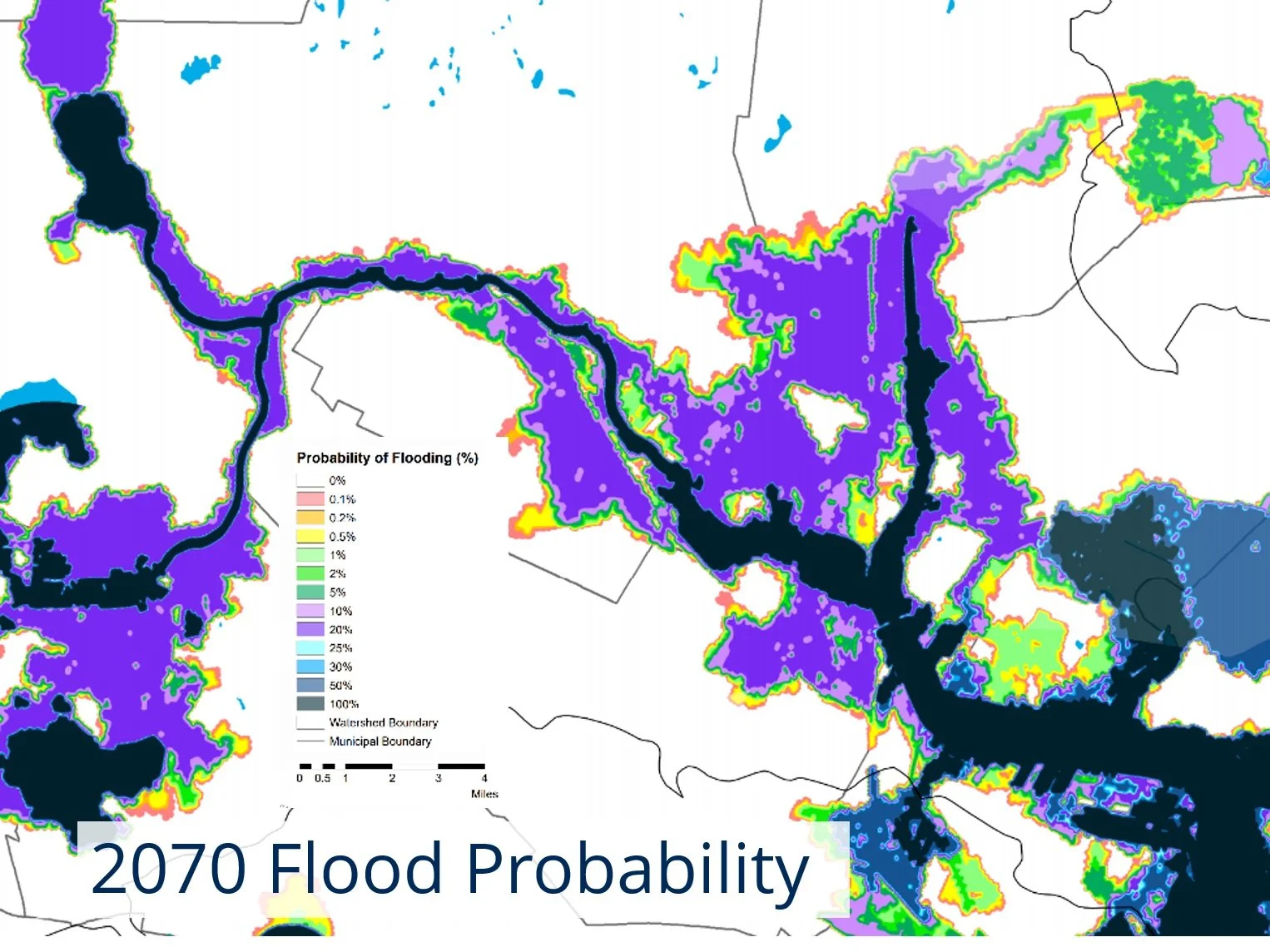 This graphic shows the likelihood of coastal flooding in the Lower Mystic Watershed around 2070 when Boston Harbor is 3 1/2 feet higher than it was in 2000. Some predictions: Downtown Malden and Medford and Cambridge’s drinking water reservoir will flood on average every five years. Parts of Chelsea, Everett and Boston will flood twice daily.