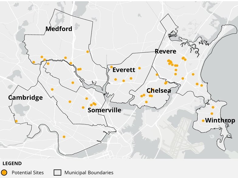Sources: Identifying and Prioritizing Flood-Prone Sites Hosting or Serving Priority Populations RMC-UMWG Resilient Flood Management Phase IV report and Envisioning Resilience in the North Suffolk Region through Emergency Preparedness Report, MVP grant awards, and updates from the City of Somerville and the Resilient Mystic Collaborative